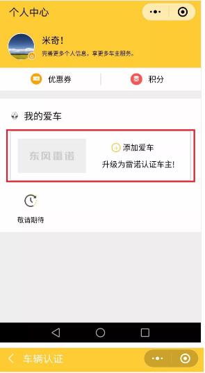 返回東風(fēng)雷諾車友會(huì)主頁面,點(diǎn)擊左下角菜單欄【個(gè)人中心】,進(jìn)入車主認(rèn)證通道。